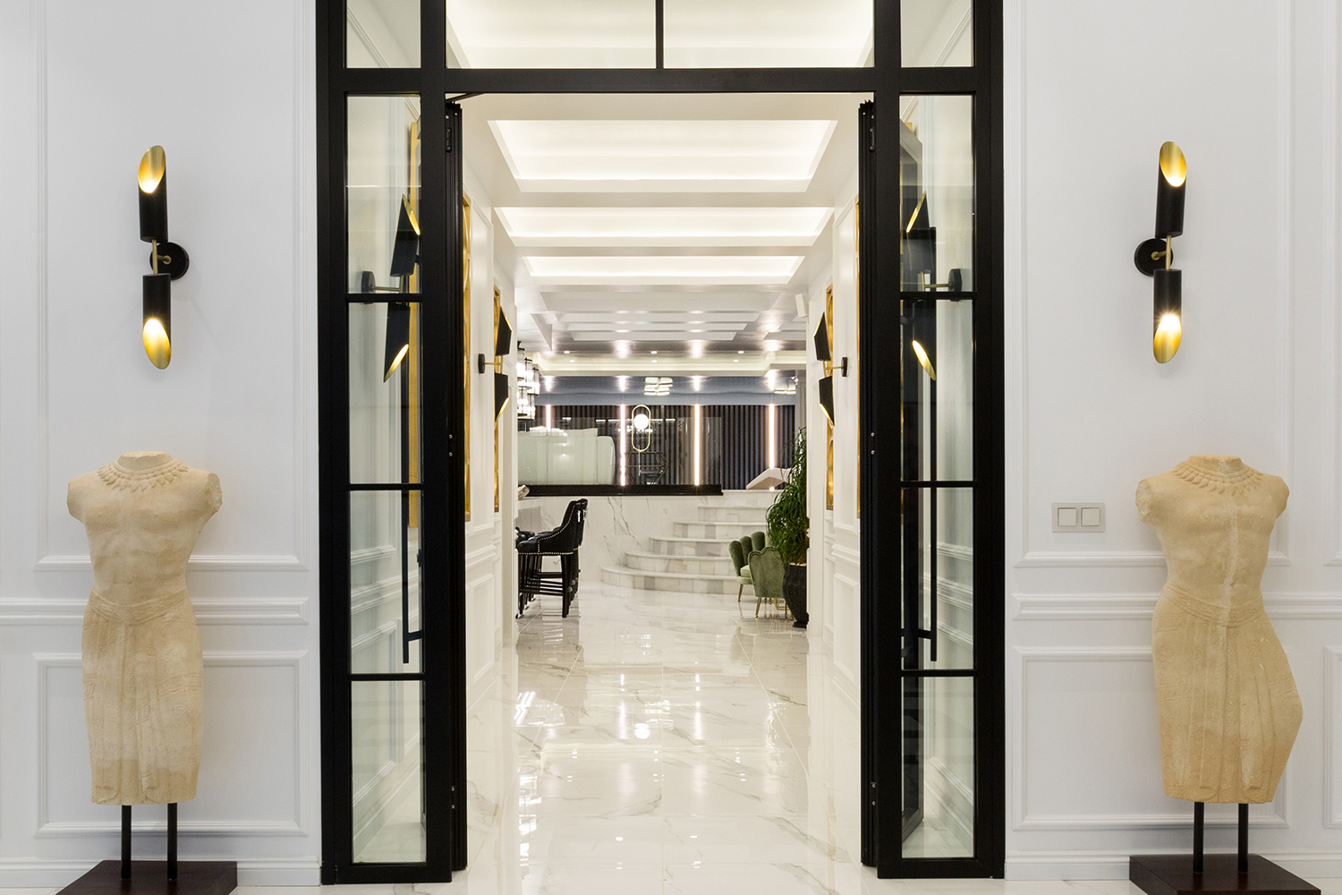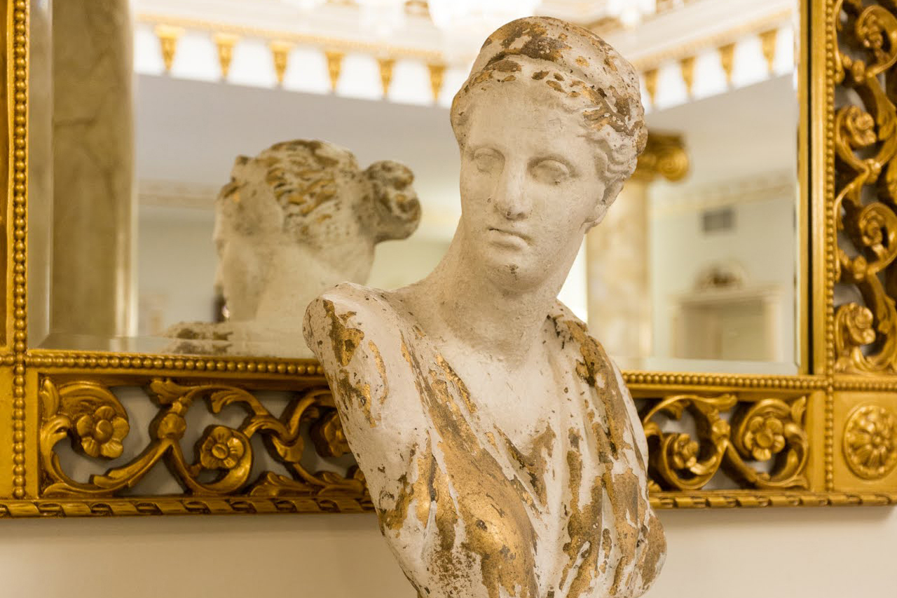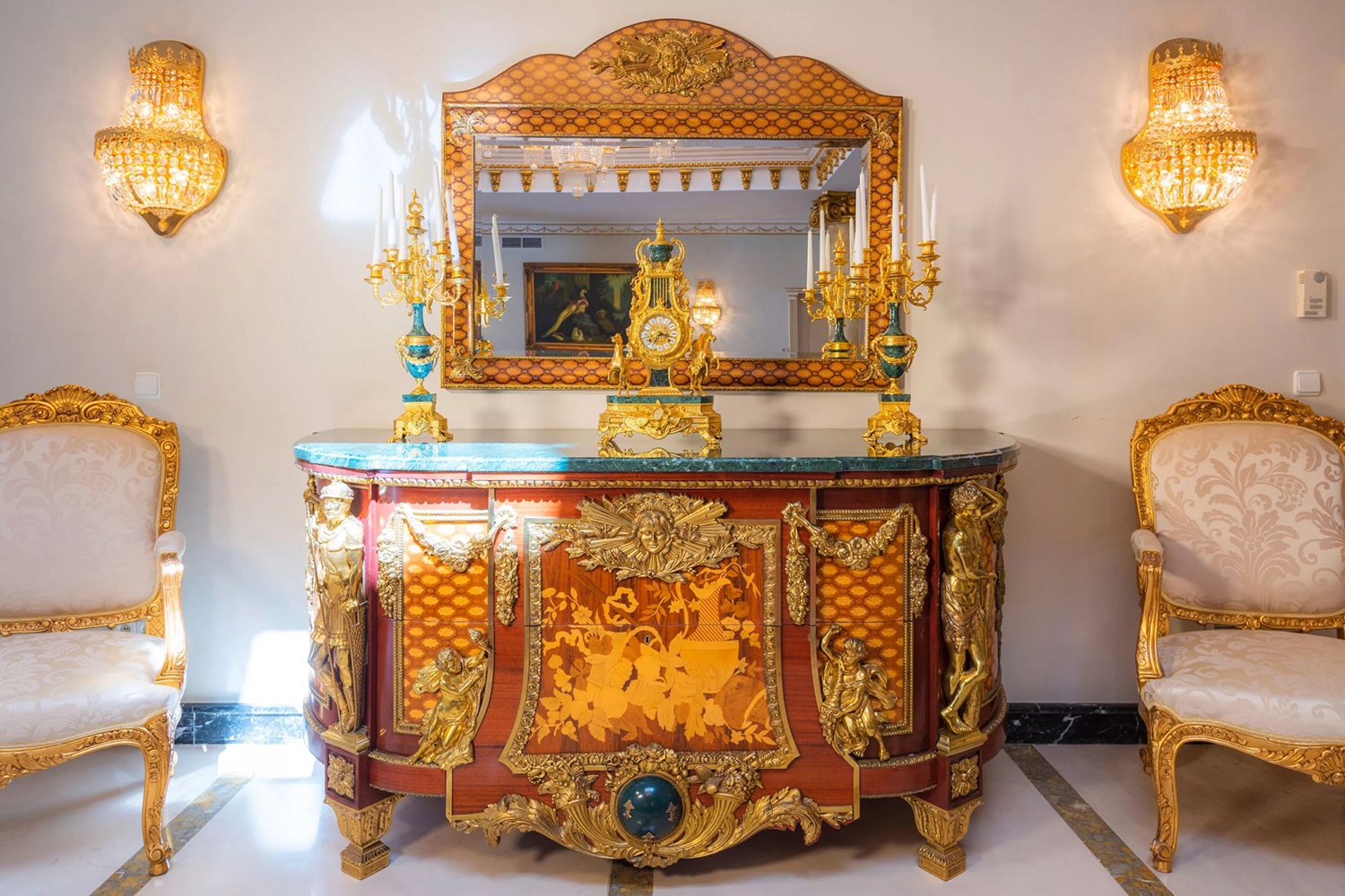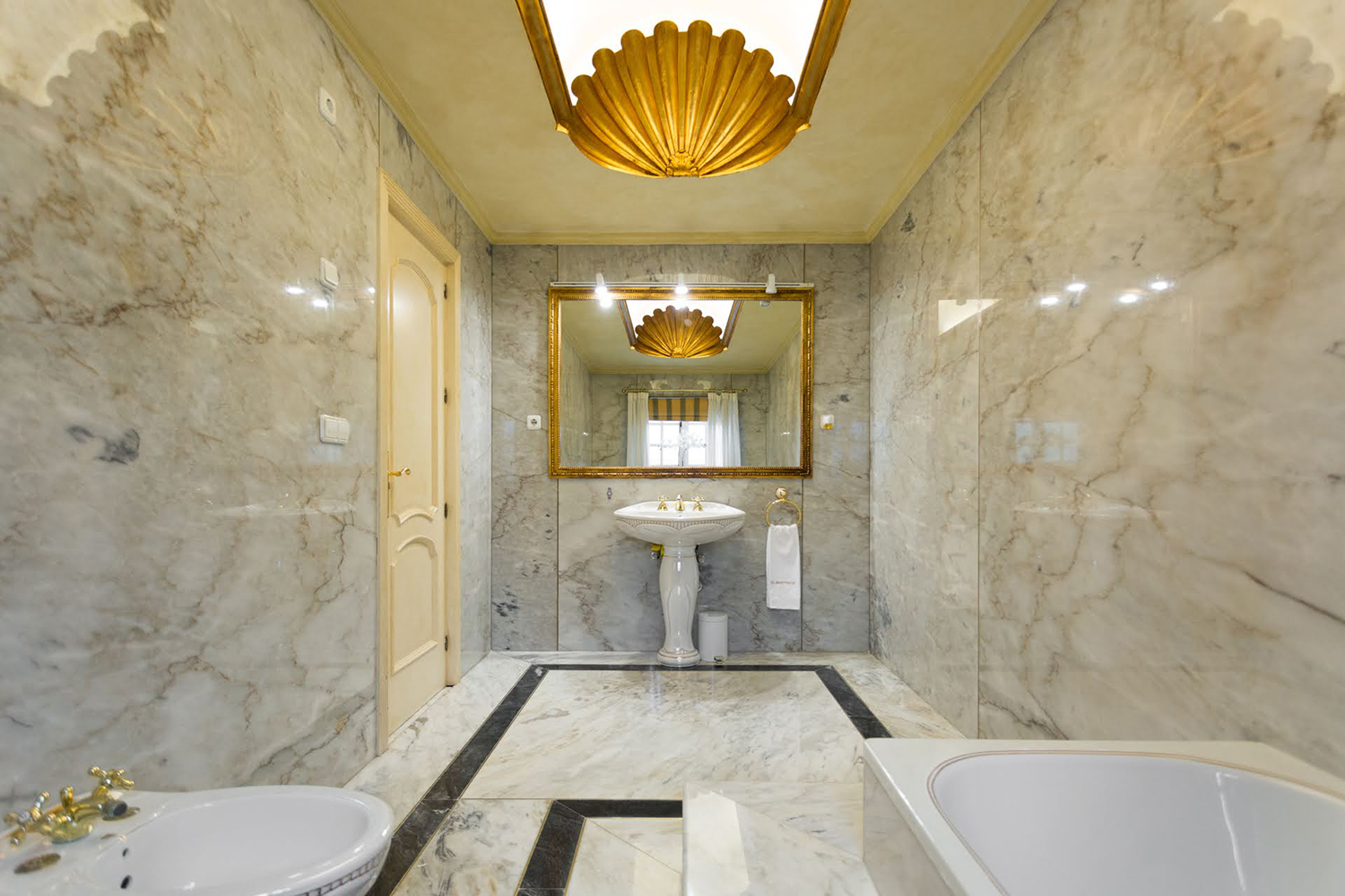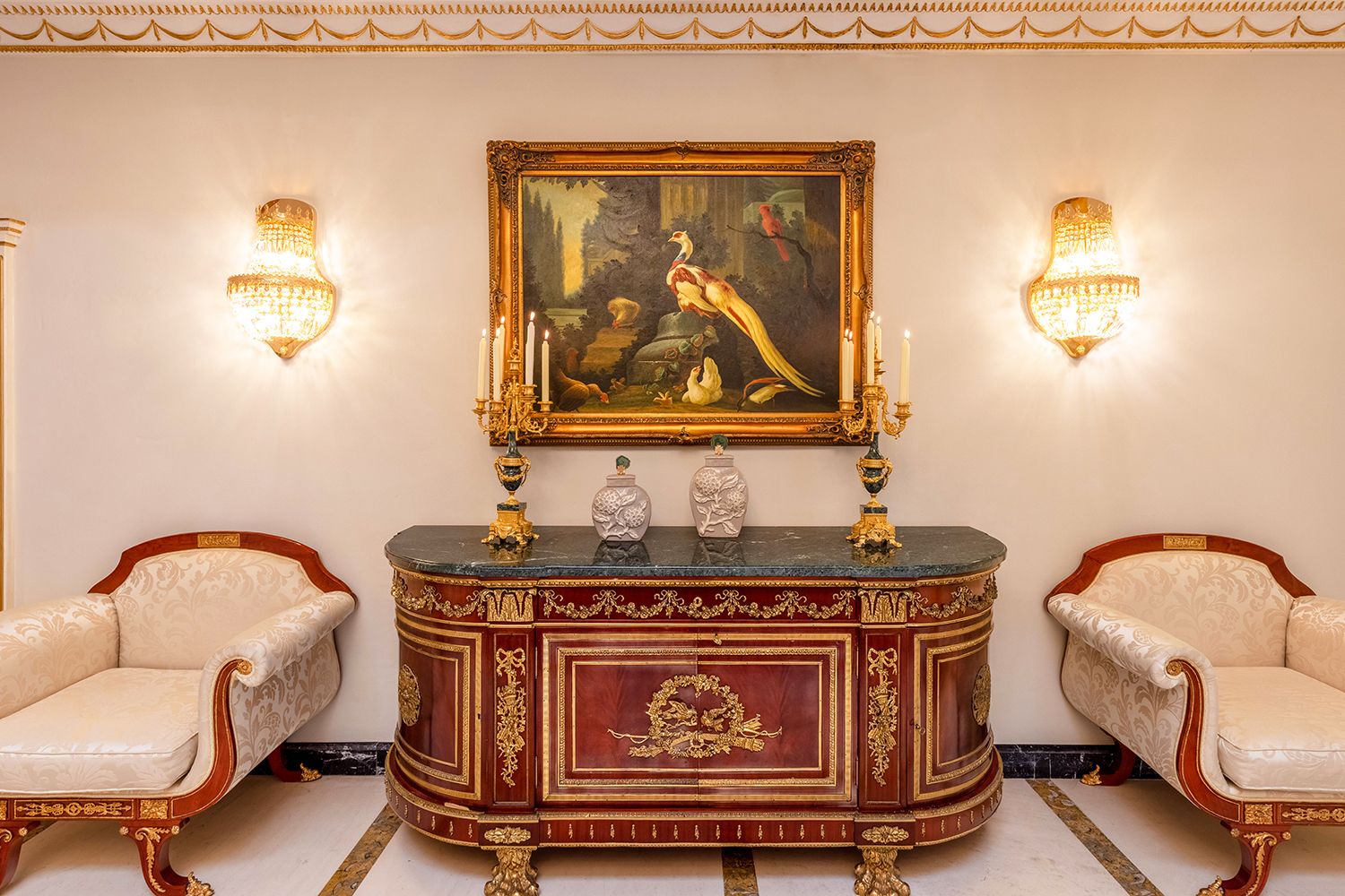 The upper floors represent a classic Baroque style with highly ornamental décor. Grand antique furnishings match the intricate architectural details of the original Villa.